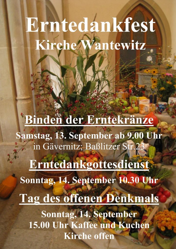 | 14.09. | 10.30 Uhr | Kirche Wantewitz | Erntedank | ||