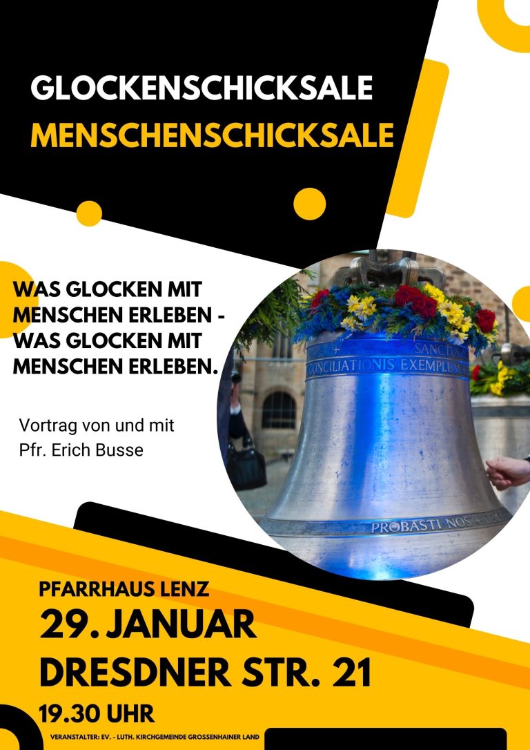 Erneut lädt der Gesprächskreis Lenz zu einem Vortrag mit dem beliebten Pfr. i. R. Erich Busse ein. Dieses mal zu dem Thema: „Glockenschicksale – Menschenschicksale. Was Menschen mit Glocken erleben – was Glocken mit Menschen erleben. Die Geschichte der Glocken ist vielfältig. Über Jahrhunderte wurden Glocken nicht nur für religiöse Zwecke, sondern auch als Signal- und Nachrichteninstrument genutzt. Deshalb gibt es auch viele interessante Geschichten um und mit Glocken, die uns wieder um viel über die Vorstellungen und Verhältnisse der jeweiligen Zeit erzählen. Wer sich also zu diesem Abend einladen lässt, erlebt eine kleine Kultur- und Kirchengeschichte vom Gebrauch und Missbrauch der Glocken, von denen allein in unserer Sächsischen Landeskirche rund 3.800 Stück ihren Dienst tun.